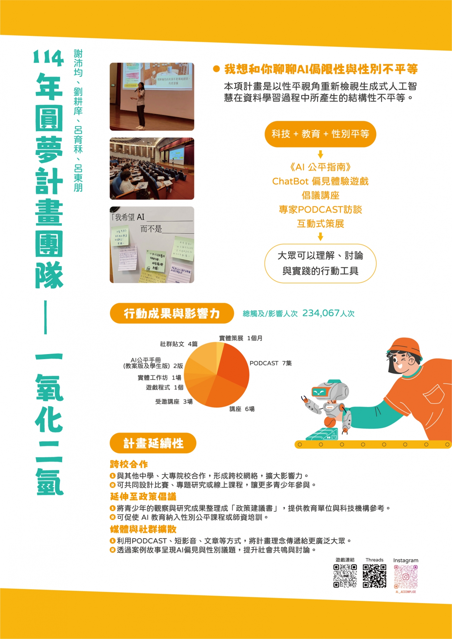 集結了114年圓夢計畫團隊之成果,女孩們將夢想結合性平議題,並透過不同形式的社會參與將性別意識傳達出去!而113年的圓夢團隊至今仍持續推動女孩權益,女孩影響力正在發酵,邀請觀展者拿起"紅點貼紙",給予行動團隊支持,成為她們持續前行的助力♡