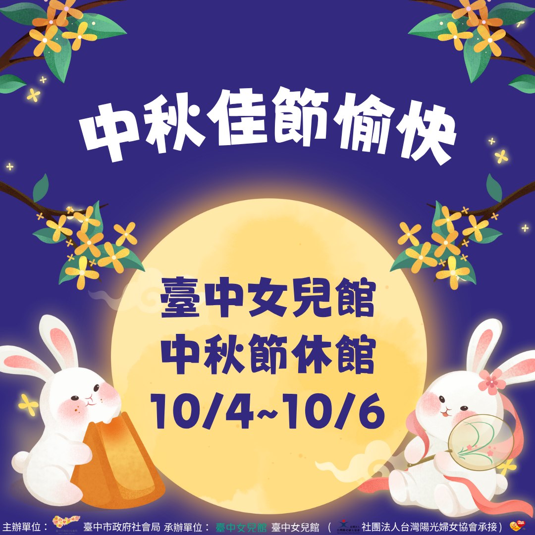 中秋將近,女兒館將於10/4~10/6休館 預祝大家中秋佳節愉快 ------------------ 女兒館各空間也持續開放線上預約 歡迎到女兒館參觀、放鬆 空間預約表單: https://reurl.cc/lNxzMQ
