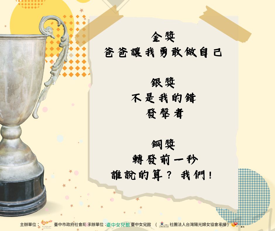 「影像發聲:女孩視界!性平無界!」獲獎者出爐囉~ 衷心感謝所有熱情參與的朋友們,本次活動共收到數百份投票與寶貴回饋 女孩們的作品展現多元觀點與創意能量,映照出屬於她們的世界。 在眾多作品中,脫穎而出的作品值得喝采,同時每一位創作者都值得尊敬 獲獎名單如下: 金獎 爸爸讓我勇敢做自己 銀獎 不是我的錯 發聲者 銅獎 轉發前一秒 誰說的算?我們!