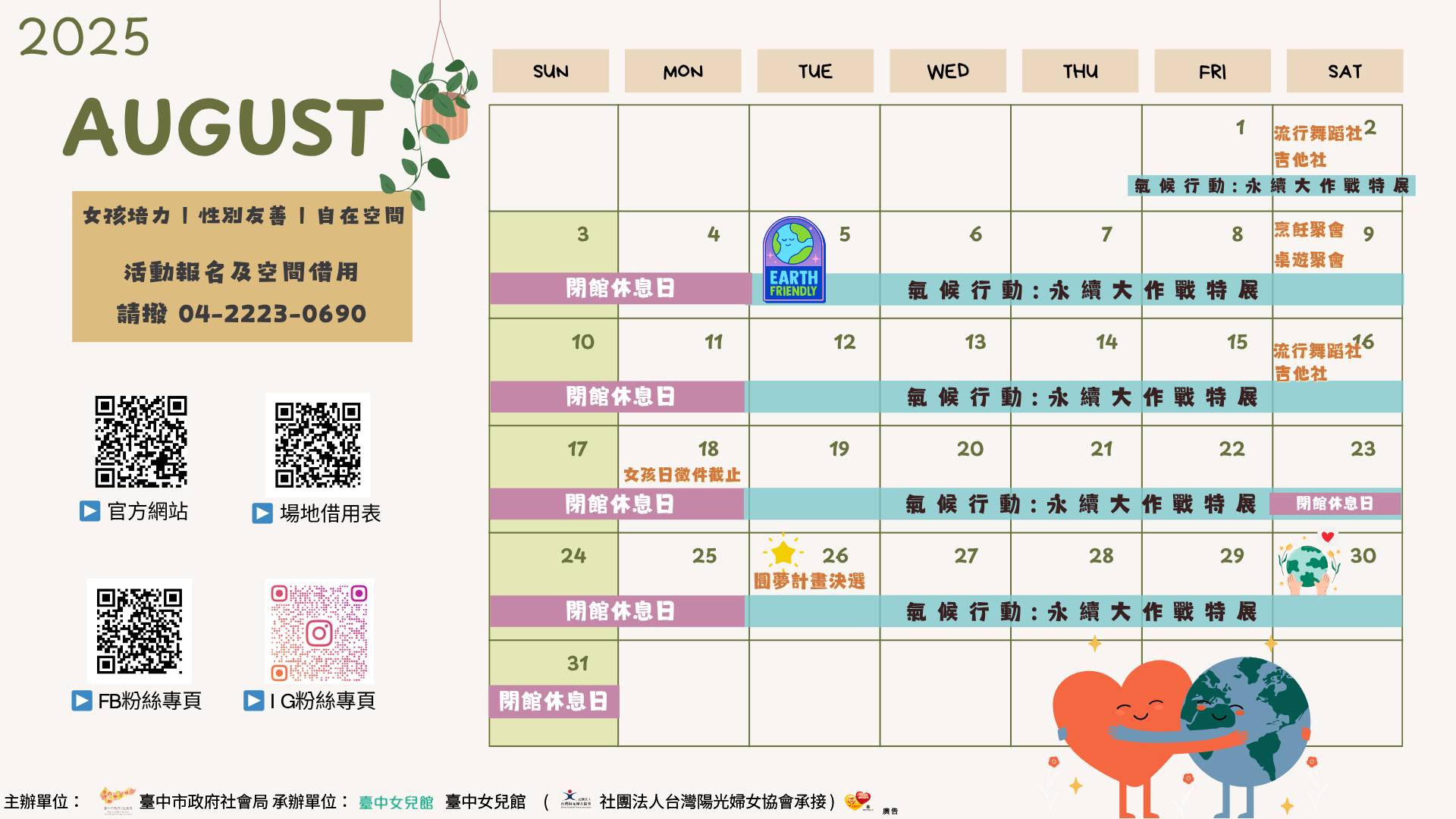#八月行事曆 女兒館八月行事曆出爐~ 女兒館影像徵件活動也持續進行中!! 歡迎對影像發聲有興趣的女孩投稿!! 豐富獎金等妳來拿: 金獎 30,000 元|銀獎 20,000 元(兩名)|銅獎 10,000 元(兩名) 官網連結:https://reurl.cc/2Q0pD9 獎金獵人:https://reurl.cc/5RGN17 報名表單:https://forms.gle/8K68H5M9x3zbJ3DR7 各空間開放一個月前線上預約,歡迎到女兒館參觀、放鬆 空間預約表單: https://reurl.cc/lNxzMQ