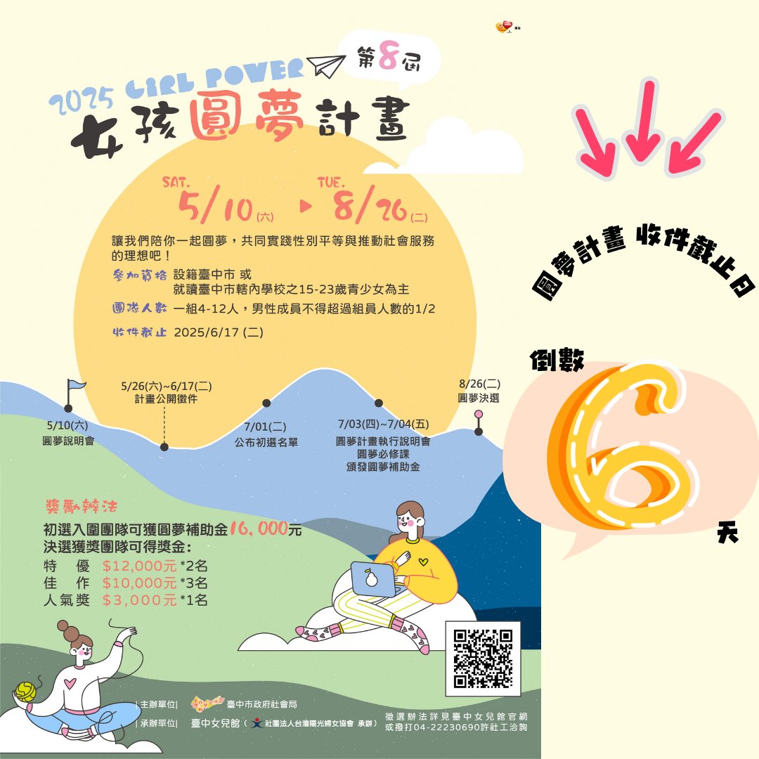 #圓夢計畫 收件截止日倒數6天 提醒報名組別團員基本資料表/個資同意書/著作權同意書 每位成員都須填寫一人一份,並印出紙本 圓夢計畫書/摘要表則需複印3份紙本檔案,並同步MAIL電子檔至女兒館信箱 所有附件裝於信封中紙本郵寄或親送至女兒館 還有6天的時間~ 不論你是有想法但找不到一起執行的夥伴 或是沒特別想法,但想參與、累積經驗 別擔心 都歡迎私訊我們協助媒合喔 讓我們陪你實踐夢想吧