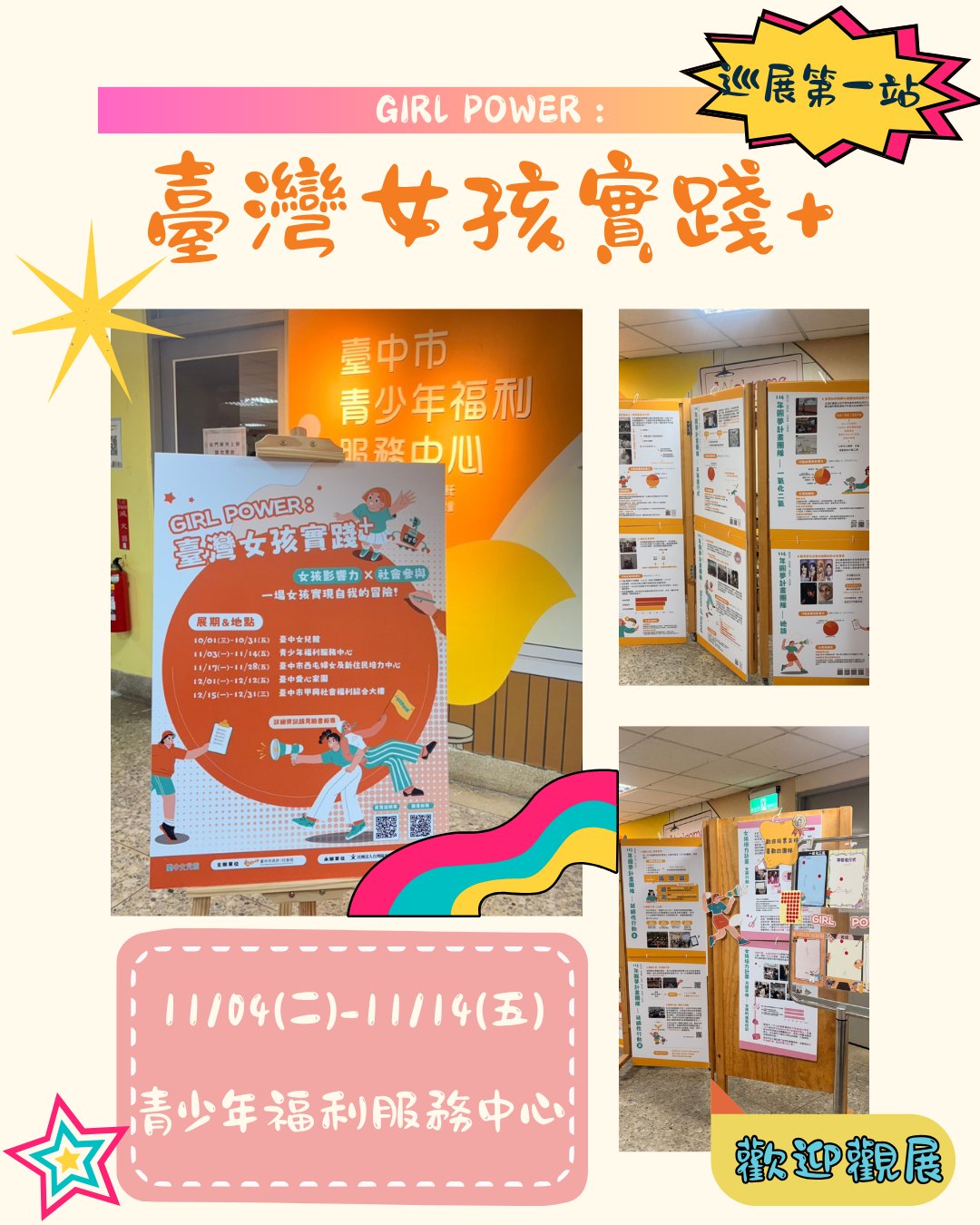 GIRL POWER: 臺灣女孩實踐+ 特展 巡展第一站: 臺中市青少年福利服務中心 (412臺中市大里區新光路32號5樓) 展覽期間:11/4-11/14 ,於青中心開館時間展出 歡迎鄰近的同學、社區民眾有到此館都可以上樓免費觀展喔 完成展覽任務後還有小禮物可以領取(數量有限,送完為止)
