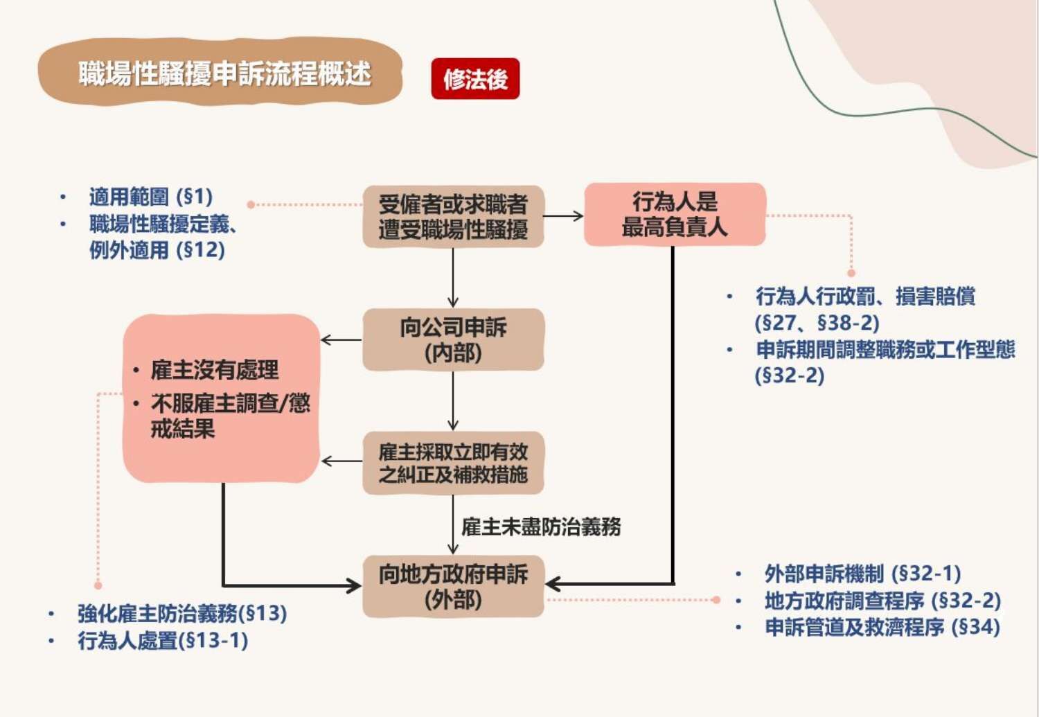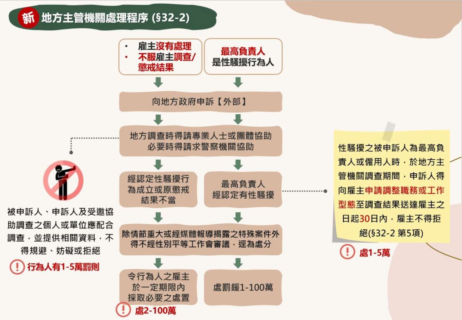 2.如行為人是最高負責人或遇雇主未處理、不服雇主懲戒結果者,則可直接向「地方政府」提起申訴。